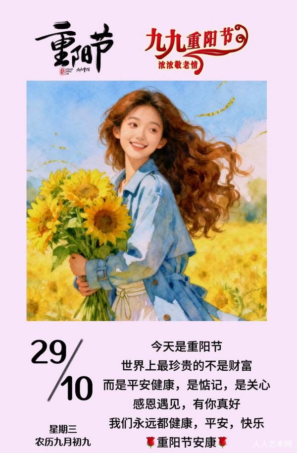 重阳佳节至,岁月映心扉,登高思远意,秋色入梦回。愿顺心如意,幸福相随。