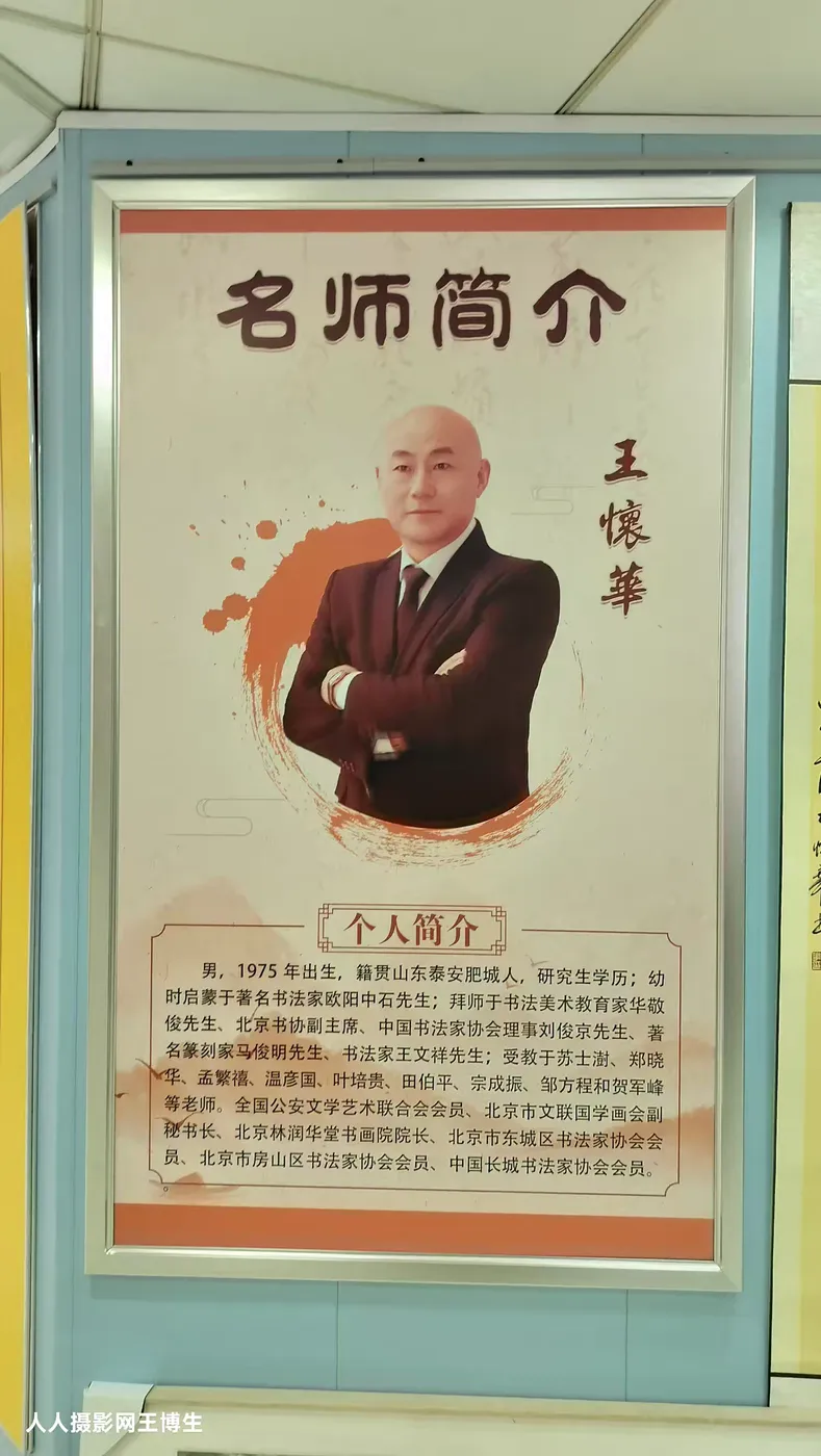 王怀华,男,1975年出生,籍贯山东泰安肥城人,研究生学历;幼时启蒙于著名书法家欧阳中石先生;拜师于书法美术教育家华敬俊先生、北京书协副主席、中国书法家协会理事刘俊京先生、著名篆刻家马俊明先生、书法家王文祥先生;受教于苏士澍、郑晓华、孟繁禧、温彦国、叶培贵、田伯平、宗成振、邹方程和贺军峰等老师。