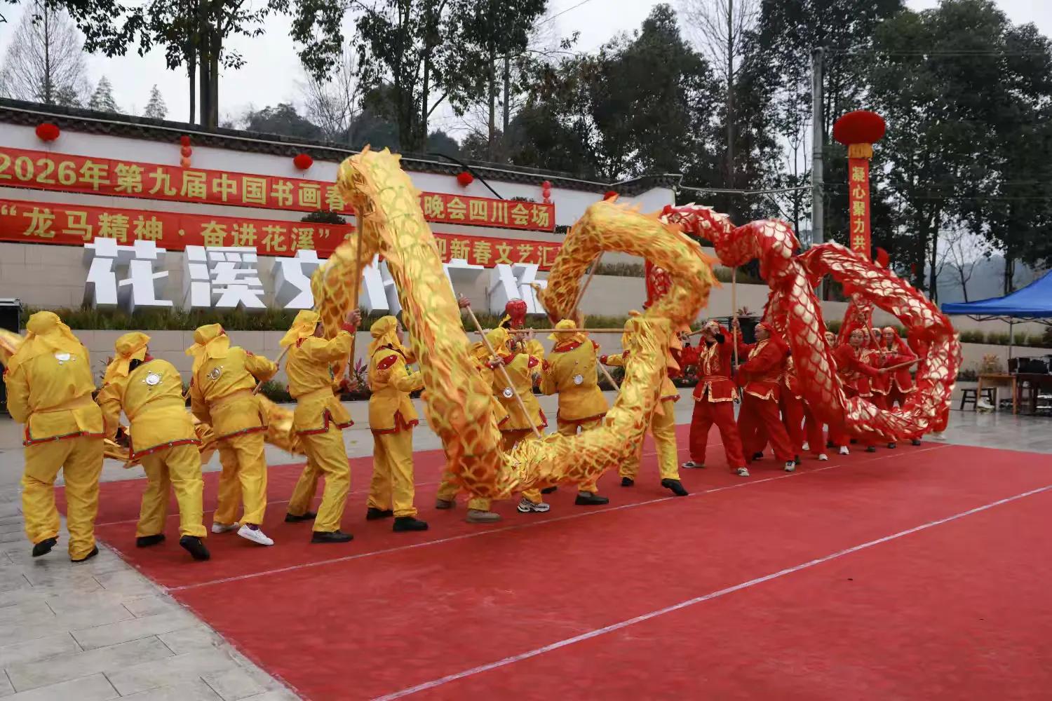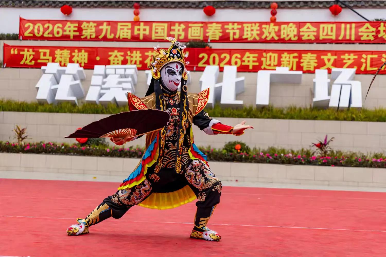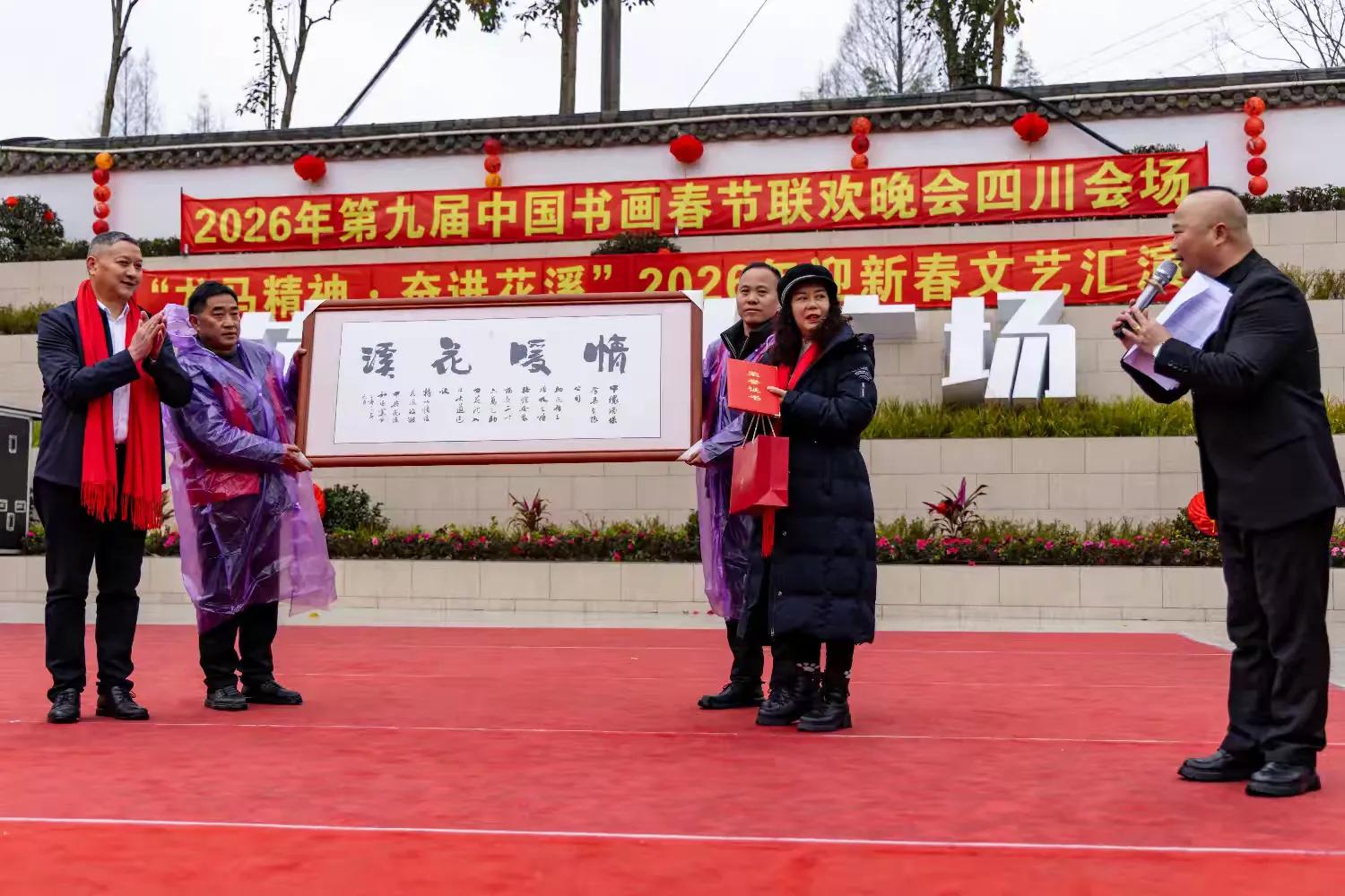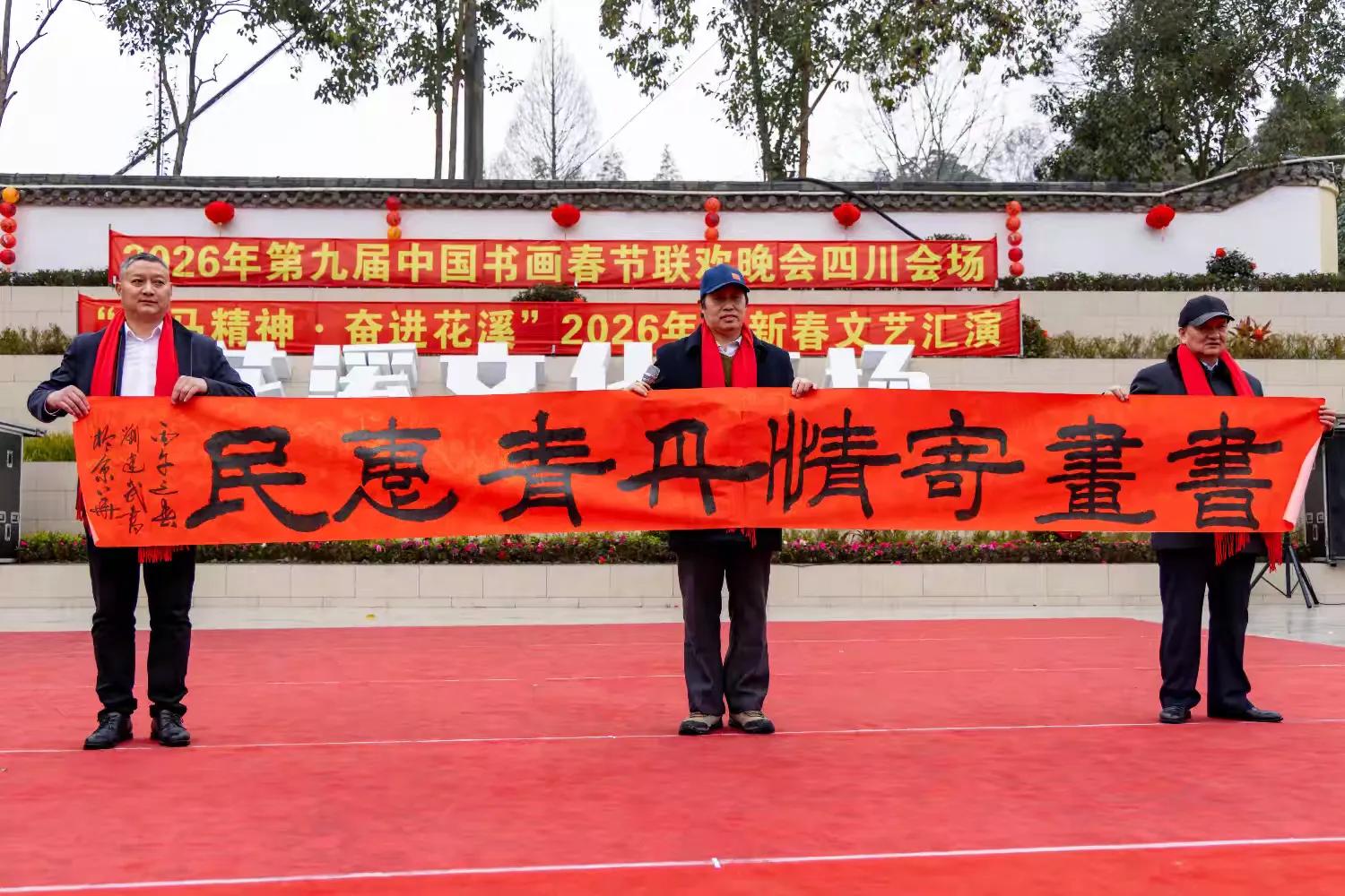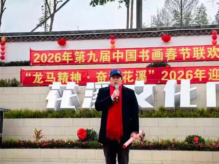 据悉,第九届中国书画春节联欢晚会以“丹青国韵,翰墨迎春”为核心主题,深耕传统文化沃土,推动书画艺术走进基层、服务群众,此次四川会场落地花溪社区,更是将书画艺术与社区文化、民俗风情深度融合,彰显了巴蜀文化的独特魅力与新时代基层文化建设的丰硕成果。活动得到社会各界广泛支持,般若寺、天一公司、小熊猫森林公园、瀚锦园林公司、聚福康生物科技公司等驻花溪单位携手赴会;中国书画春节联欢晚会总策划总导演王博生,北京生态摄影协会会长高菡,中国书画春晚主持人丁然,都江堰青年摄影家协会受邀出席;第九届中国书画春节联欢晚会四川会场总策划龚大成、总导演左顺勇全程参与活动,与全体花溪居民欢聚一堂,共贺2026丙午马年新春,共话文化传承,共谋社区发展。