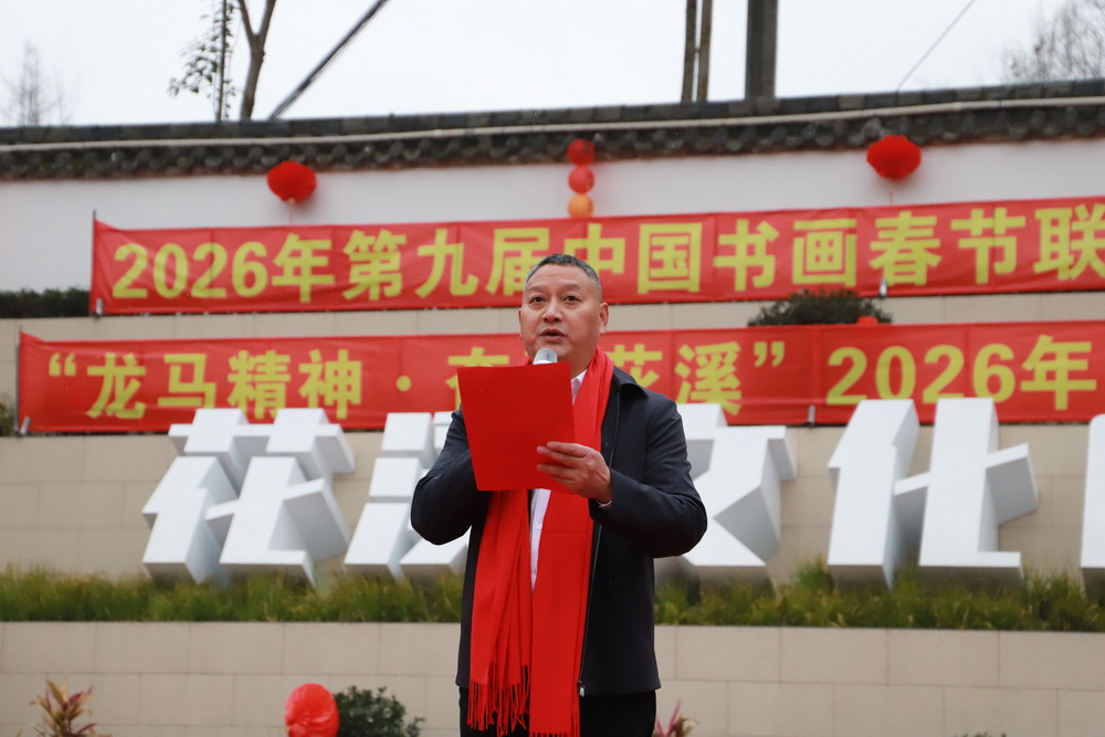第九届中国书画春节联欢晚会四川会场总导演、花溪社区党委书记左顺勇发表热情洋溢的讲话