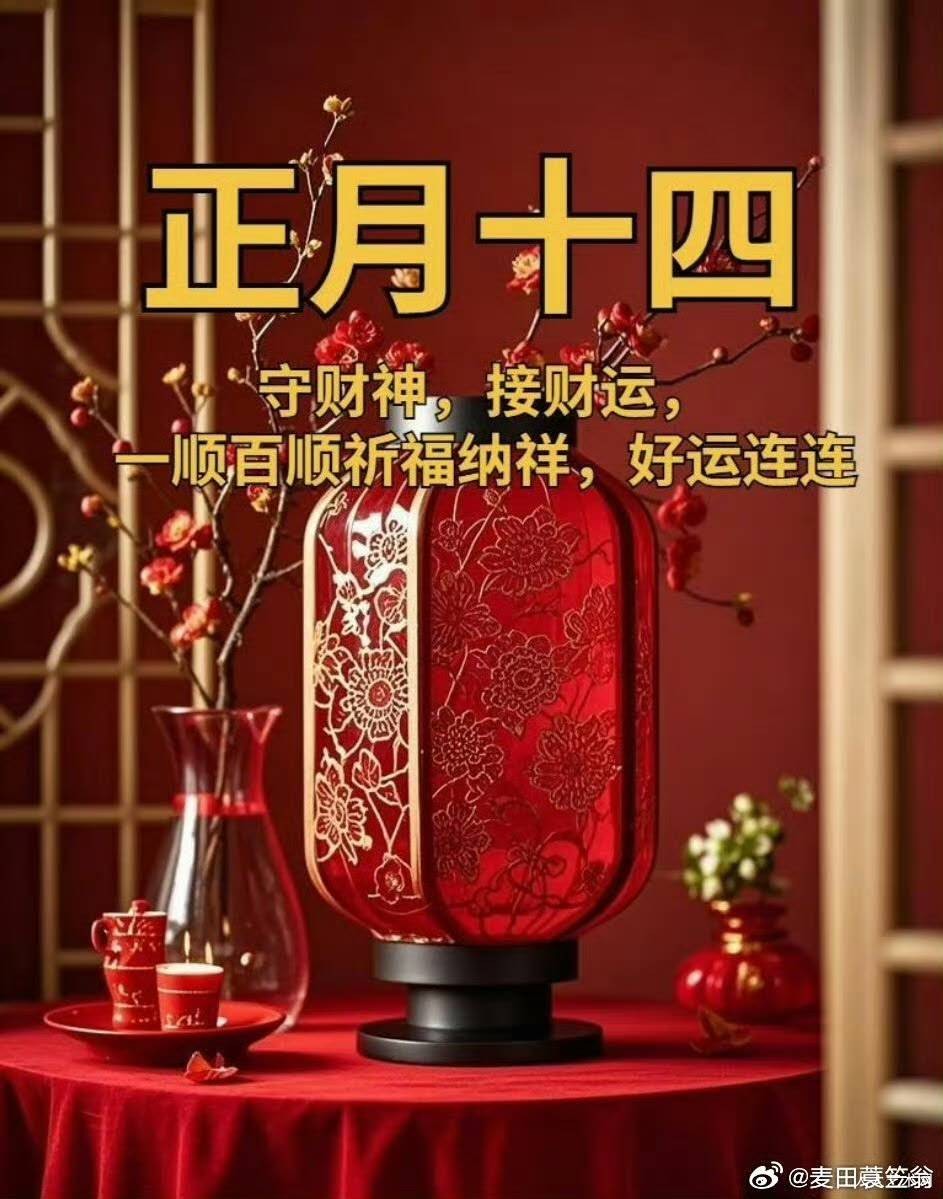 [摘要] 正月十四,守财纳福正当时。新春余韵未散,人间烟火正浓,这一天承载着满满的期许与祥瑞。 愿财门轻启,纳八方之珍;钱树繁茂,聚四海之金。账户数字节节高升,事业前程一马平川。更愿父母如松柏常青,身体硬朗;生活似暖阳和煦,事事圆满。 在这个预示着富足与好运的日子里,把十重祝福送给每一位朋友。愿大家钱包鼓鼓,财运亨通,把昨日的欢喜延续,把明日的财富锁定,马年行大运,万事皆芬芳!