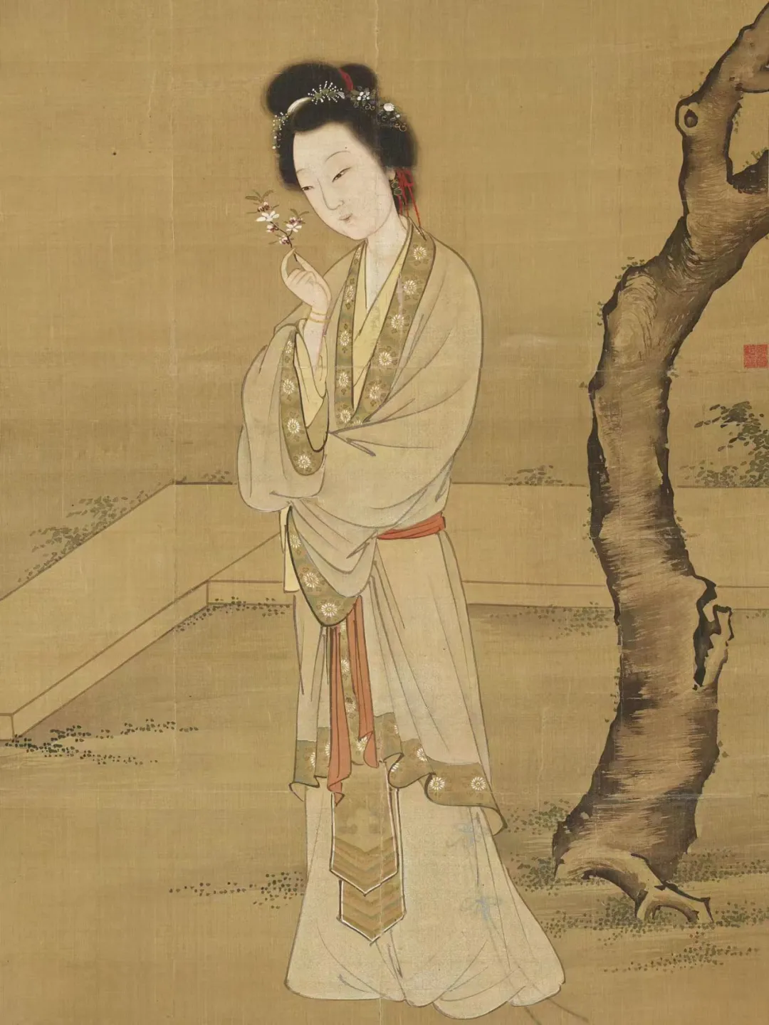 《人面桃花图》是明代画家张纪的作品,现藏于英国国家博物馆。画中女子身着对襟袄,腰佩宫绦,头梳蝶鬓髻,并戴嵌有珍珠、金丝的配饰,展现出明代女子淡雅精致的风貌。