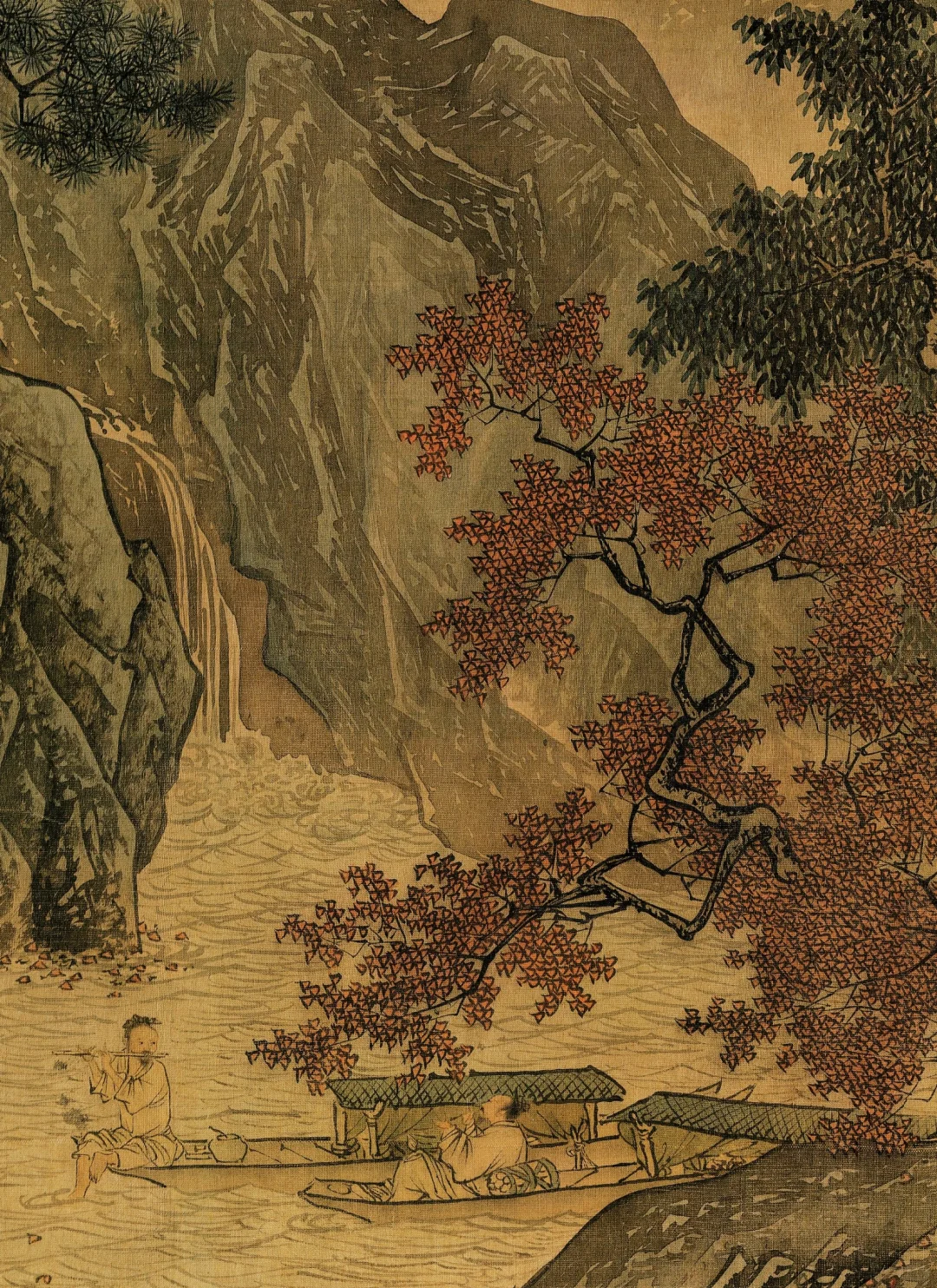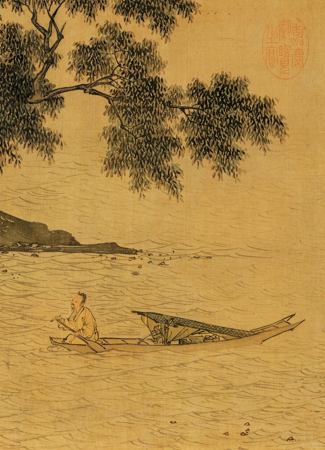 《溪山渔隐图》是明代画家唐寅的作品。画面以山水为主题。画家运用简洁的笔触和淡雅的色彩,营造出一种宁静、悠远的氛围。作品中的山水造型简洁大方,线条流畅自然,体现了明代中式美学注重简洁与流畅的特点。同时,画家通过对渔夫的描绘,表达了自己对自由、闲适生活的向往。