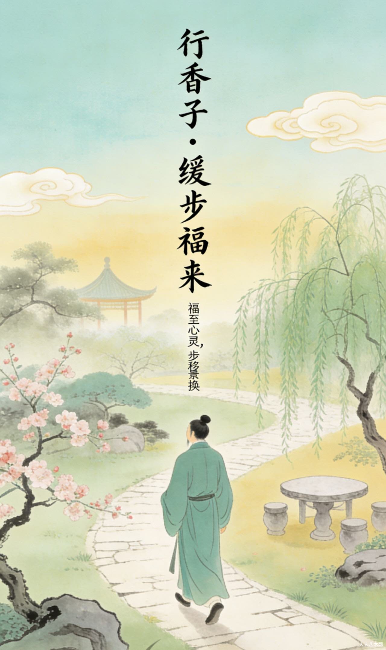 此词以缓步生福为意,写尽人生从容之道。上阕言言语放缓,深思慎言,语带温润,远离纷争;中阕言行事沉稳,不贪速成,静待佳时,自有收获;下阕言心境宽和,卸下烦忧,知足常乐,于风月云烟中得清欢。全词温润自然,无雕琢之气,于平淡中见智慧,劝人放慢脚步,修心养性,守一份安然,得绵长福气,意蕴醇厚,动人心弦。