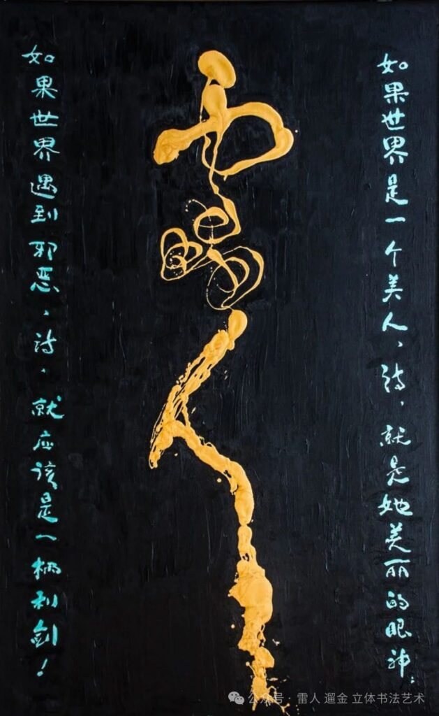 雷人首创的立体书法,彩色豪华版汉字书法艺术,不仅让3000年的黑白书法平面获得新生,它也成为新的取代传统绘画的艺术新宠,雷人行走金丝立体书法艺术的表意与色彩,以独特的“划线画”,将成为补充和拯救传统艺术的绚丽艺术形式。
