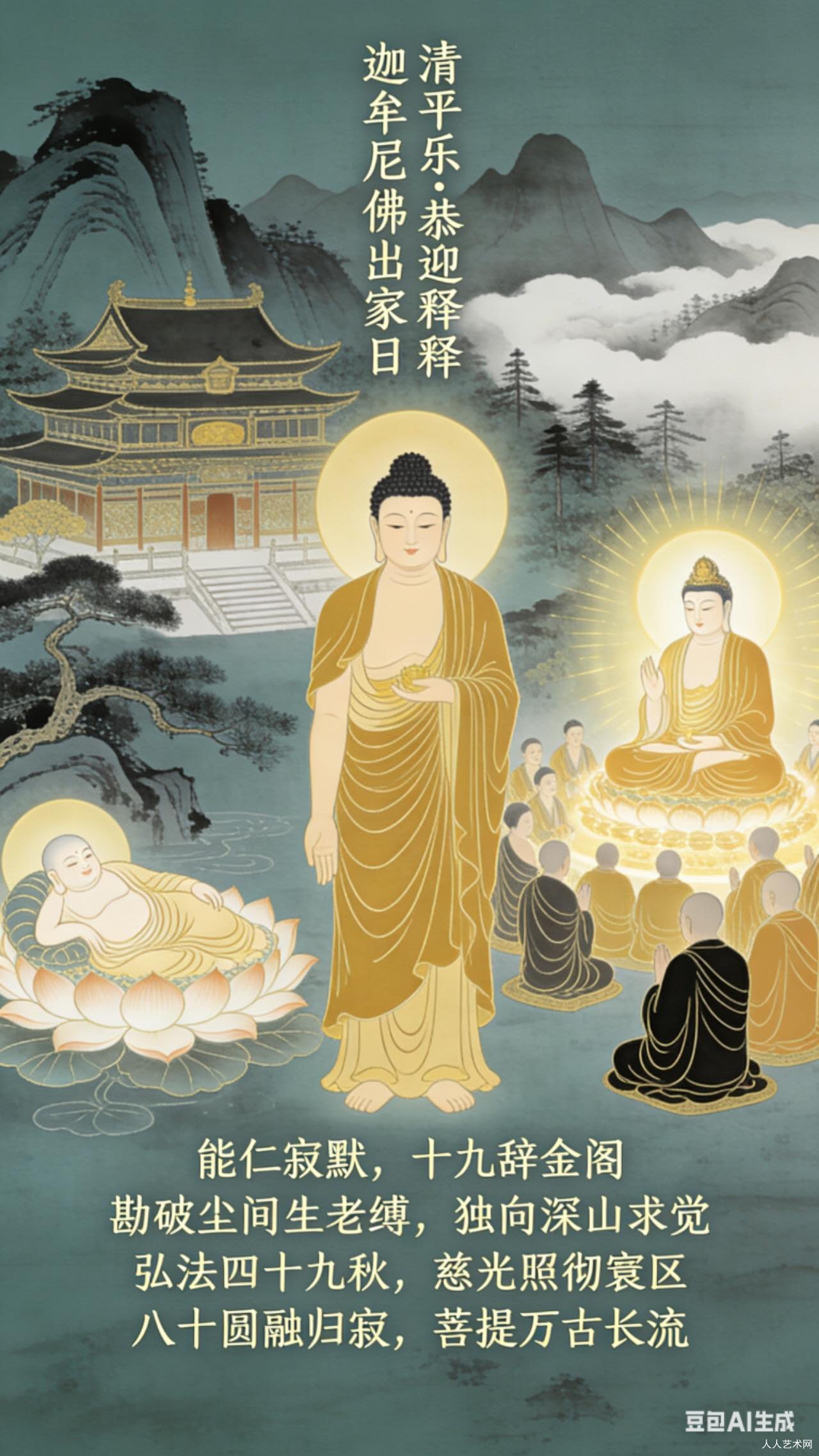 关键词: 能仁寂默,辞宫出家,勘破生死,深山求觉,弘法四十九年,慈光普照,八十涅槃,菩提正法,万古流芳