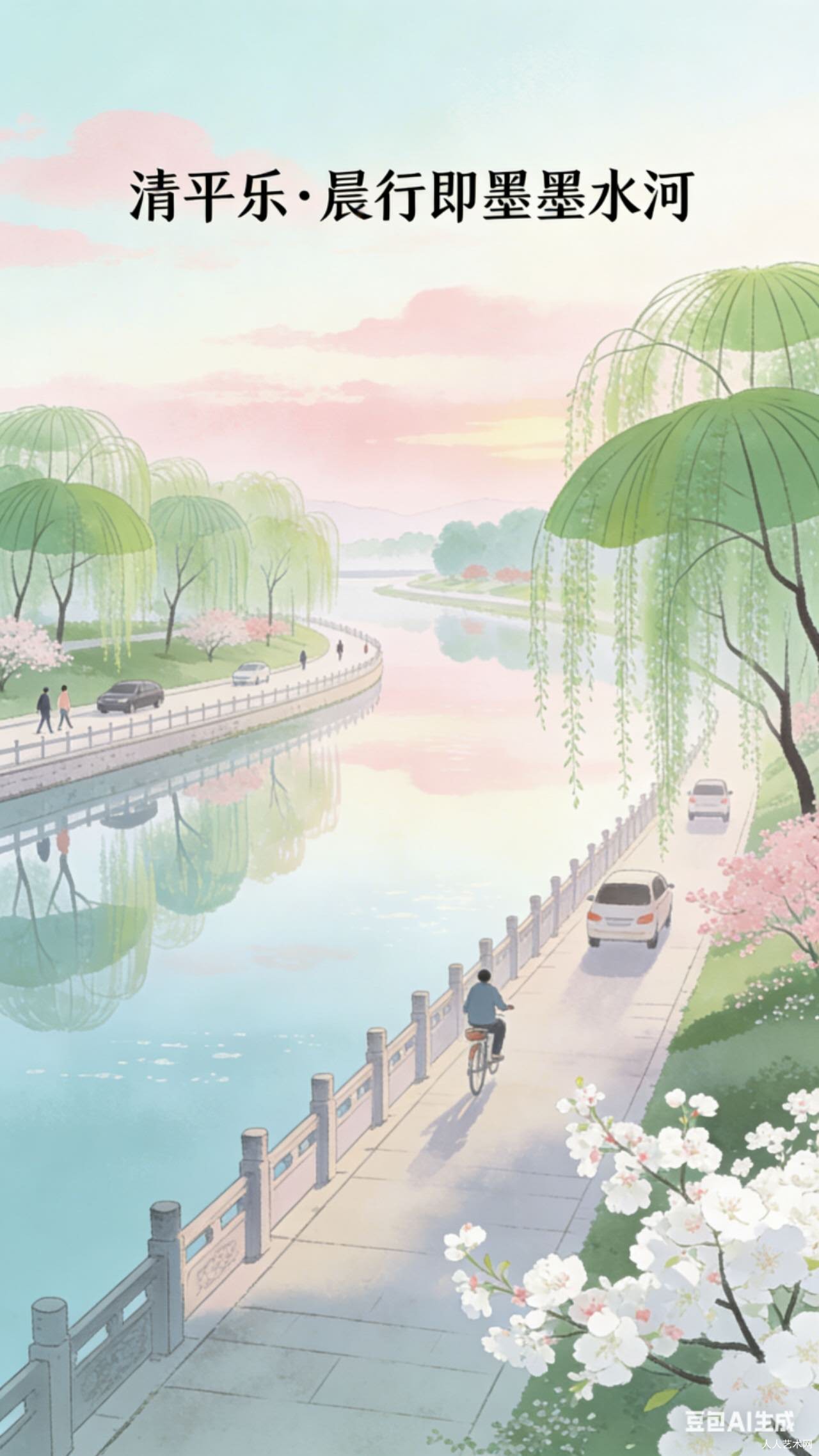 这首词描绘出青岛即墨墨水河畔春日清晨的清灵景致。晓风轻柔,河面平静如镜,古城墙影倒映水中,静谧安然。岸边新柳舒展,绿意盎然如伞,粉白桃李次第绽放,繁花点点,春意盈满枝头。水面波澜不惊,云影天光相融,岸上行人车马往来匆匆,动静相映成趣。一河两岸,古城春色如画,自然之美与人间烟火相融,置身其间,恍若步入仙境,心神悠然,忘却凡尘俗事,尽显春日清晨的恬淡与诗意。