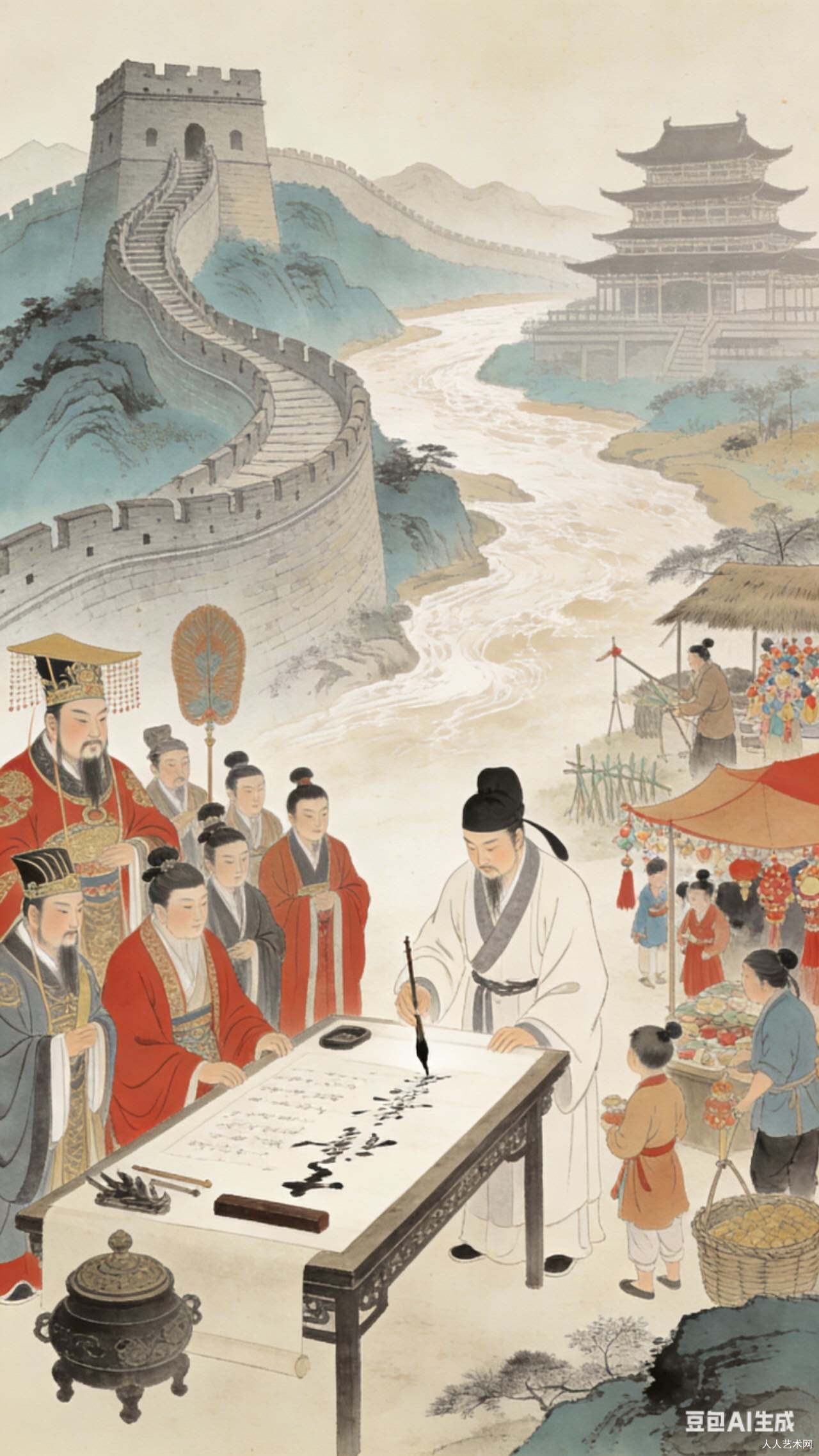这首《南歌子·中华五千年》凝练勾勒出华夏千年壮阔史诗。上片从盘古开天、神农尝草起始,叙黄帝征战、仓颉造字、大禹治水,将上古创世与先贤功绩娓娓道来。下片历数夏商周至唐宋元明清的朝代更迭,道尽英雄浮沉与岁月沧桑。全词以历史脉络为骨,以家国情怀为魂,字句质朴厚重,既展现文明传承的源远流长,又以明月照古人为结,抒发出对千年华夏与古今英豪的深沉慨叹,意境雄浑悠远。