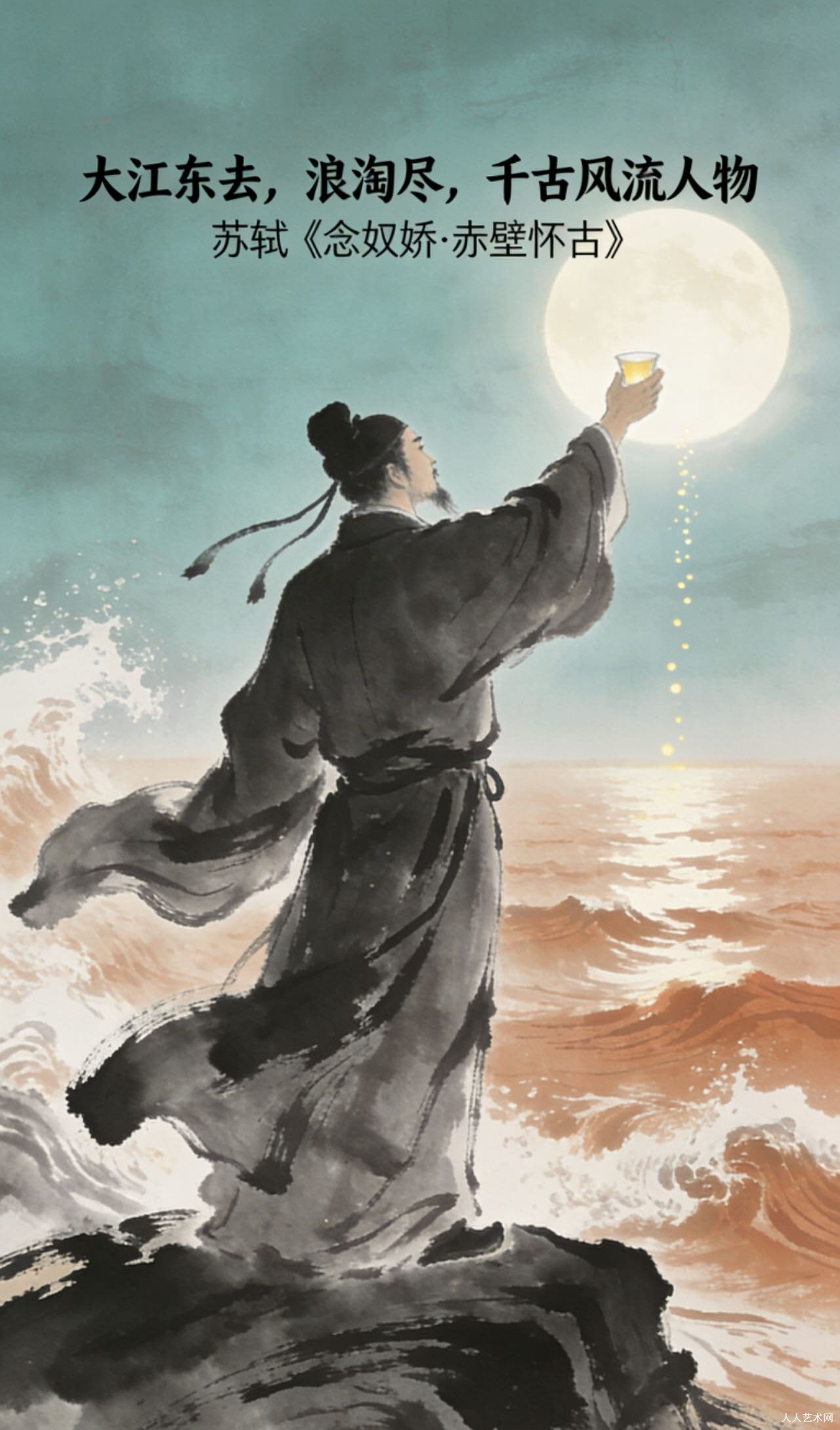 苏轼这首《念奴娇·赤壁怀古》,是宋词豪放派的千古绝唱。以“大江东去”的壮阔开篇,将三国周郎的雄姿与赤壁江景熔于一炉:乱石崩云、惊涛拍岸的雄奇,谈笑间樯橹灰飞烟灭的豪情,尽显历史风云的磅礴。词人贬谪黄州,借怀古抒怀,叹周郎伟业的同时,自嘲早生华发,最终以“一樽还酹江月”的旷达,消解人生浮沉的怅惘。全词笔力千钧,豪情与苍凉交织,写尽江山如画的盛景,道透人生如梦的通透,穿越千年仍震撼人心,让读者在历史沉思中,读懂苏轼的旷达风骨与生命智慧。