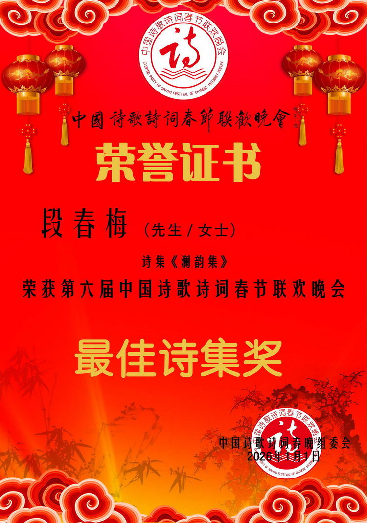 段春梅诗集《澜韵集》荣获第六届中国诗歌诗词春晚最佳诗集奖